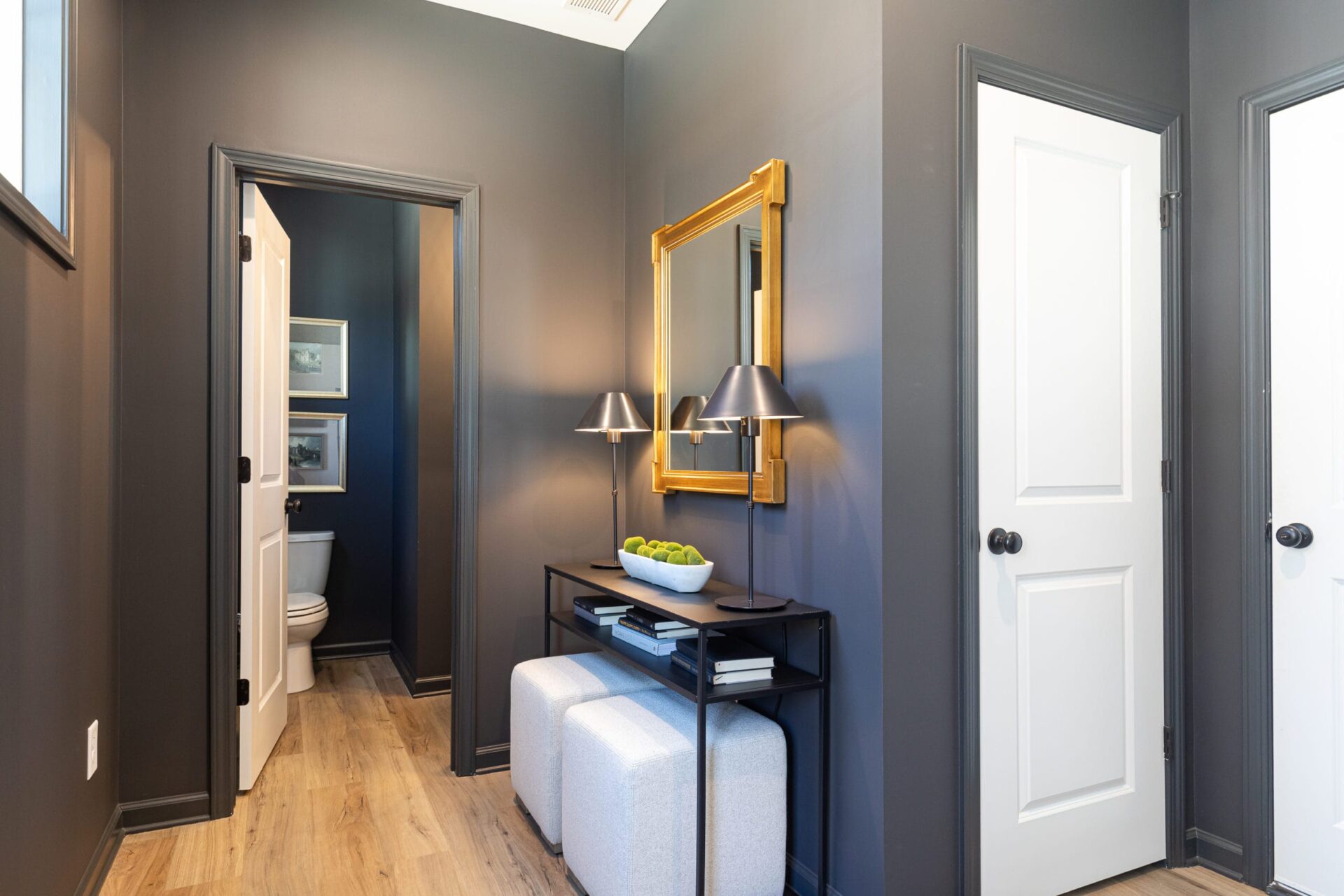 A console helps to ground the space, and provides a perfect place to catch your mail and keys so they don’t end up on the kitchen counter. Incorporating stylish accessories and some pretty greenery can help add some panache and a sense of freshness to the entire space.