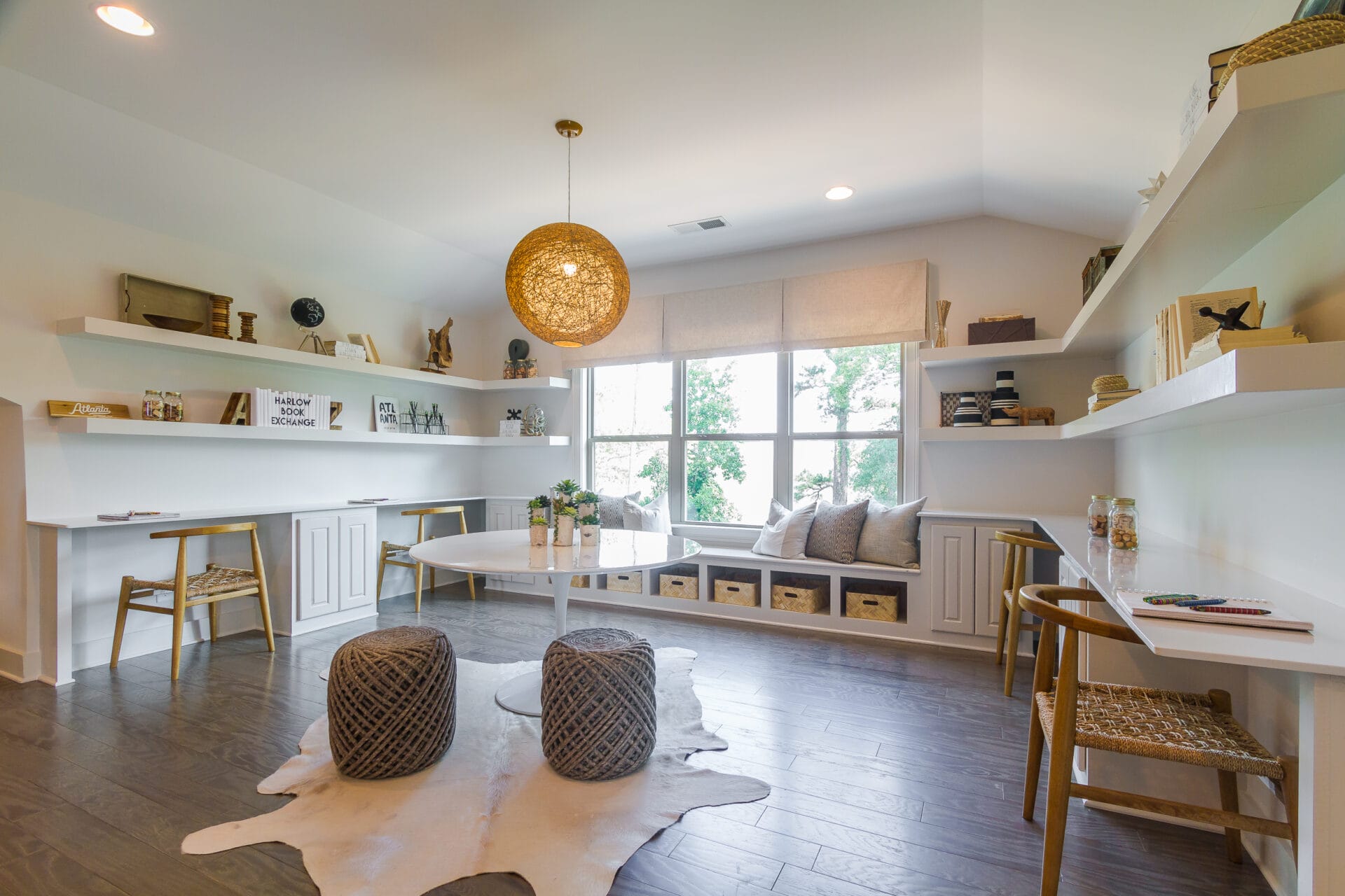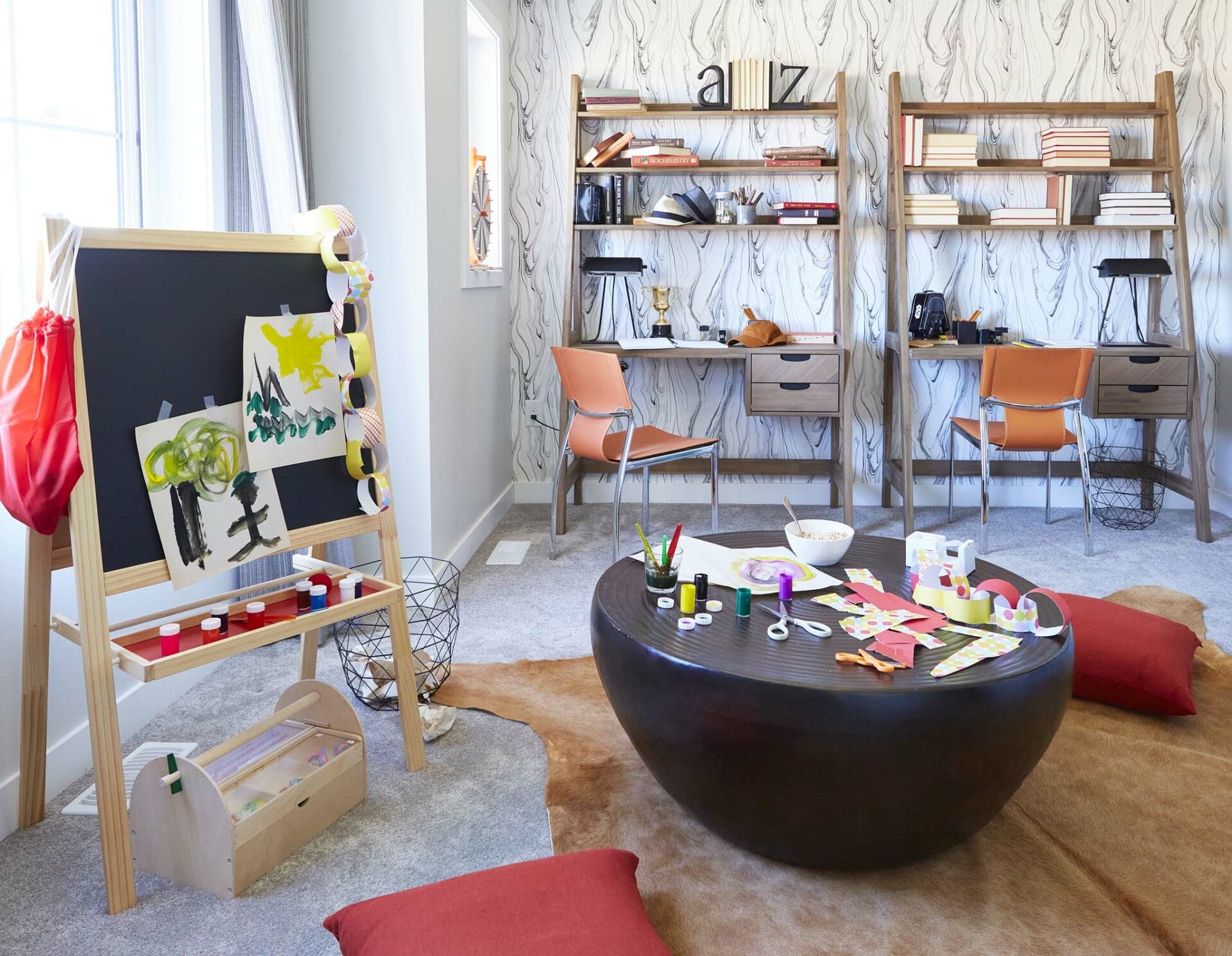 Give your kids their own designated place to complete homework, paint or draw with desks that are built into or resting against the wall. Place a round table in the middle of the room with a few seats around to encourage collaboration when family projects are underway or when board games are being played. Additional storage can be found underneath the bench where kids can read all afternoon, or along the floating shelves around the room.