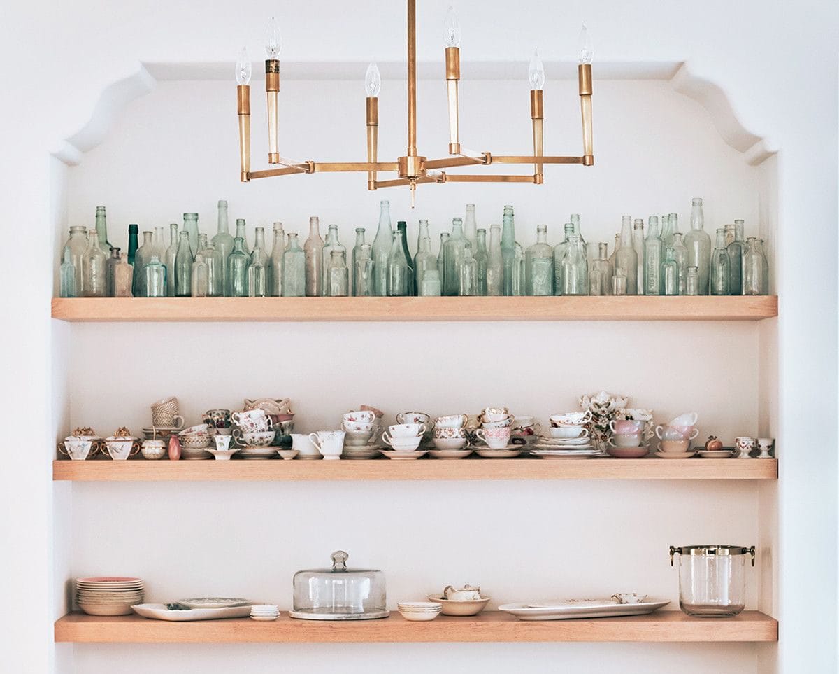 Lauren Conrad displays her growing collection of vintage bottles and teacups with exposed shelves in her kitchen, with absolutely stunning results.