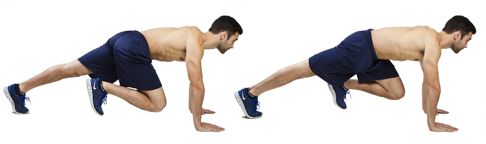 • 30 seconds mountain climbers (start in a plank position with arms fully extended, bring your alternating knees into your chest quickly as show in photo below)