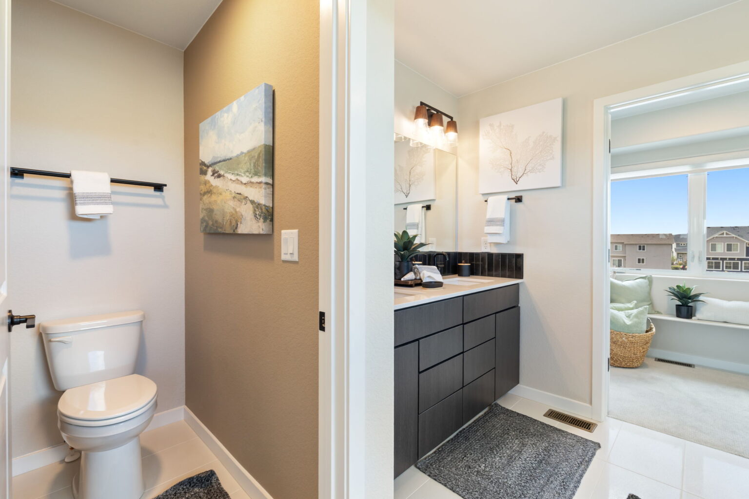 The great room is centered around a cozy fireplace, perfect for relaxing evenings or gatherings. Upstairs, the primary bathroom showcases sleek quartz countertops, adding a touch of luxury to your daily routine. Stylish wrought iron railings add a modern architectural detail, while central air conditioning ensures year-round comfort.
