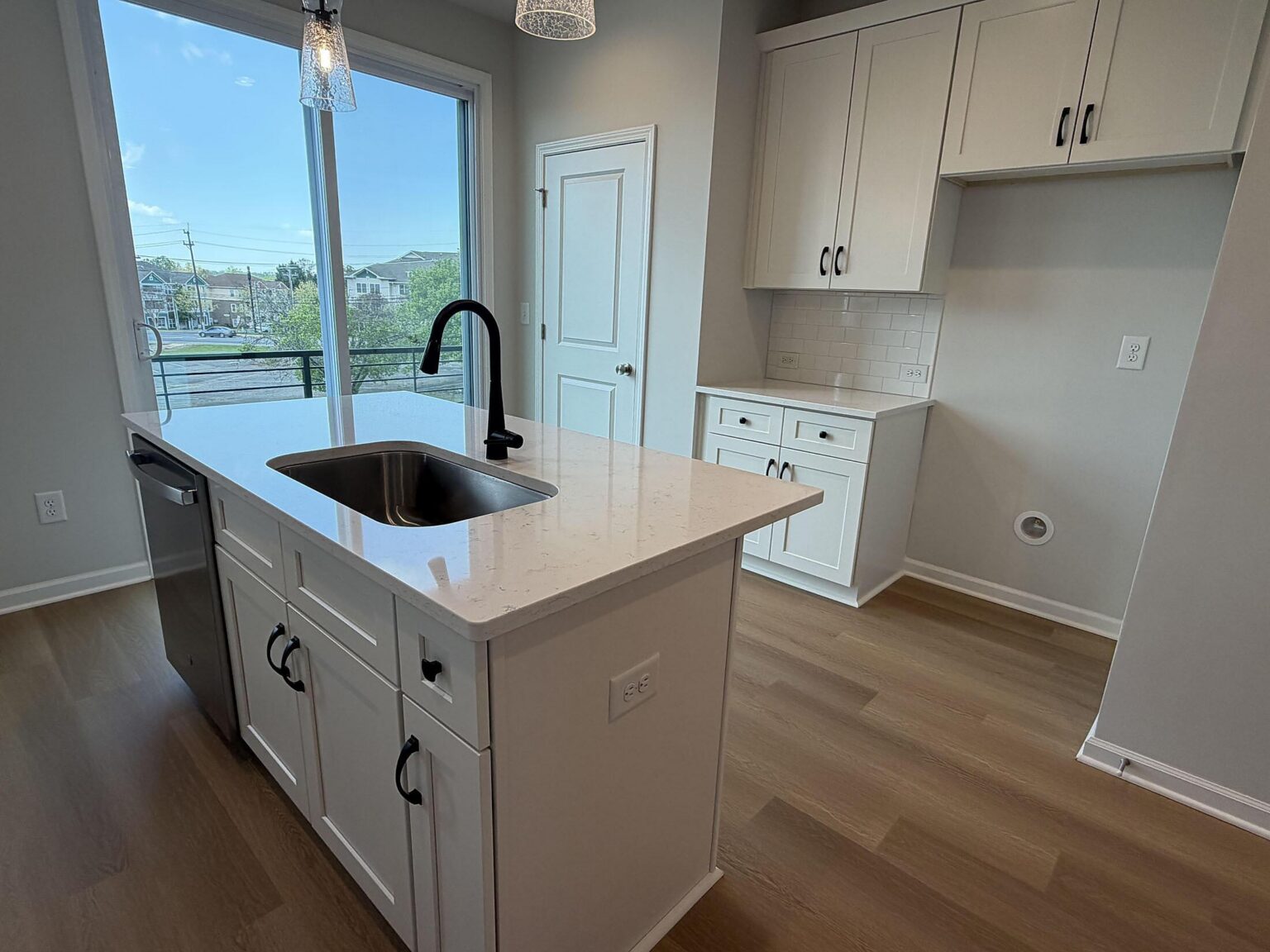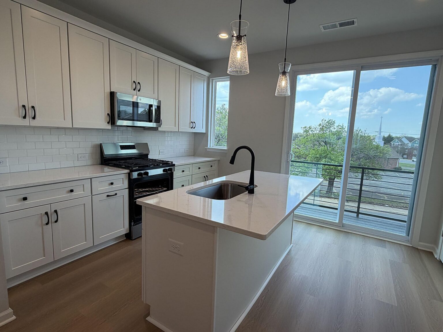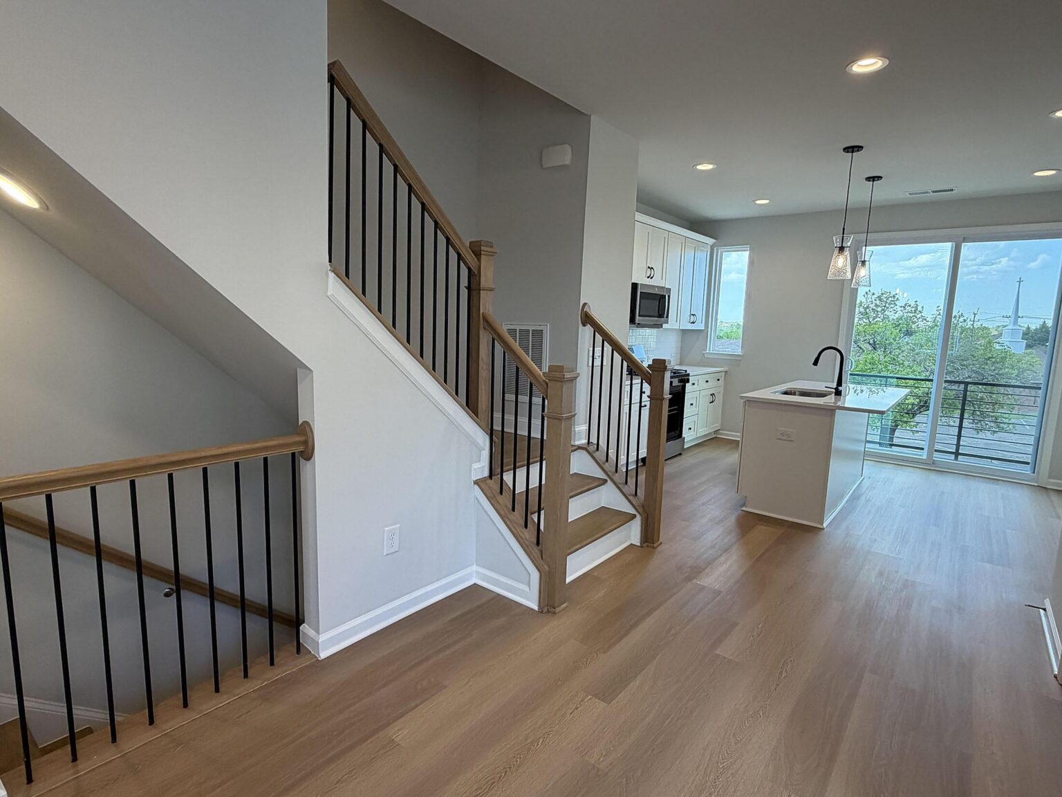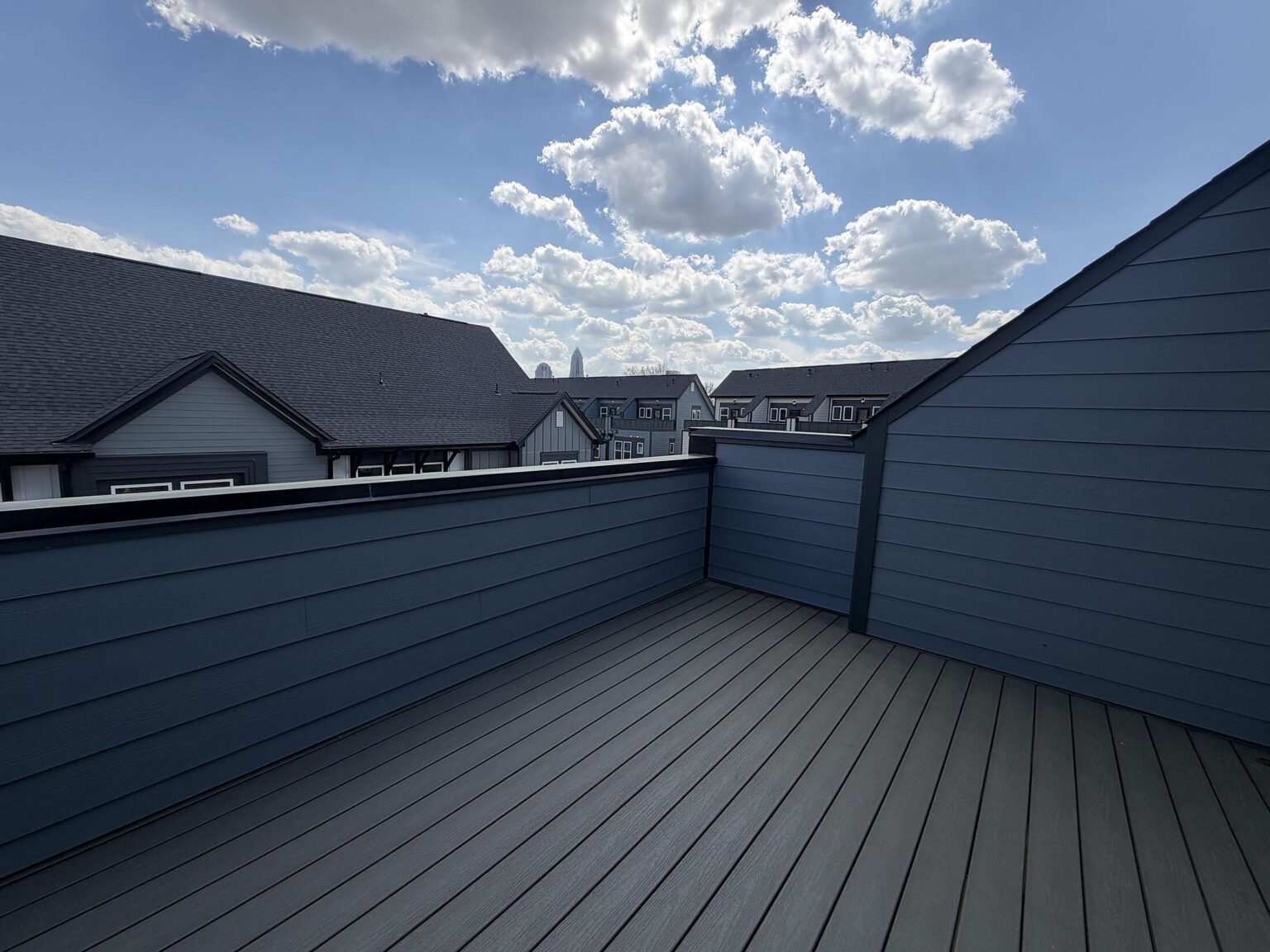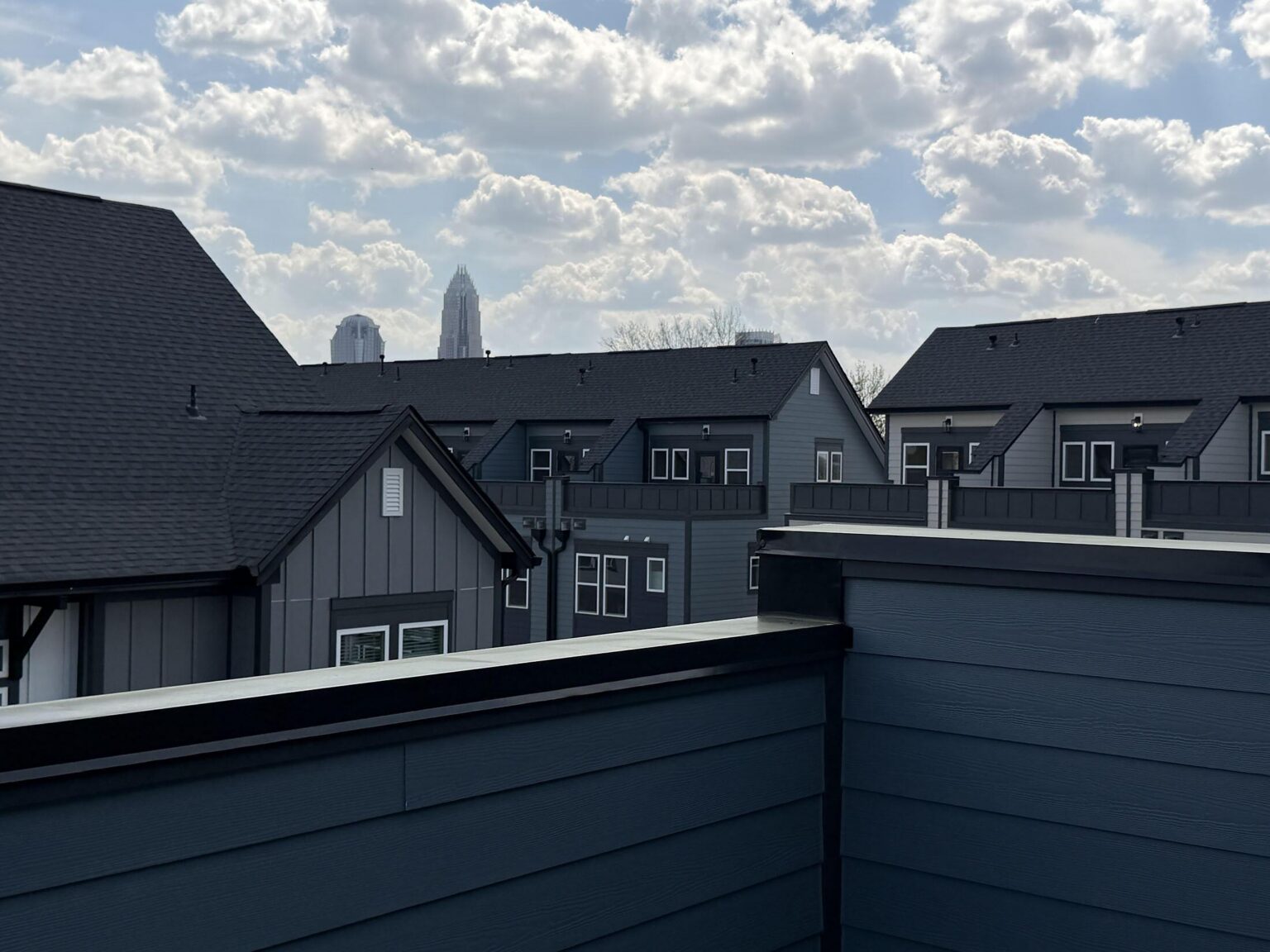 This end-unit townhome has a 1-car garage, 1st floor flex room with powder, 4th floor bedroom and a spacious rooftop terrace with a slight view of uptown. It's walking distance to Camp North End. Open layout on the 2nd floor. Kitchen has 42" cabinets with matte black hardware, quartz counters, trash pullout, GE SS appliances with gas range. The 3rd floor hosts the laundry closet, Premier Suite and secondary bedroom. Premier bath includes quartz counters, tiled floor, and tiled shower with semi-frameless surround and built-in shampoo niche. Guest bath has quartz counters and tiled floor. Chrome hardware in baths. LVP floors throughout 1st & 2nd floors & 3rd floor landing, with oak treads on all stairs. Walking distance to bars, restaurants, events, and more! Additional street parking is available.