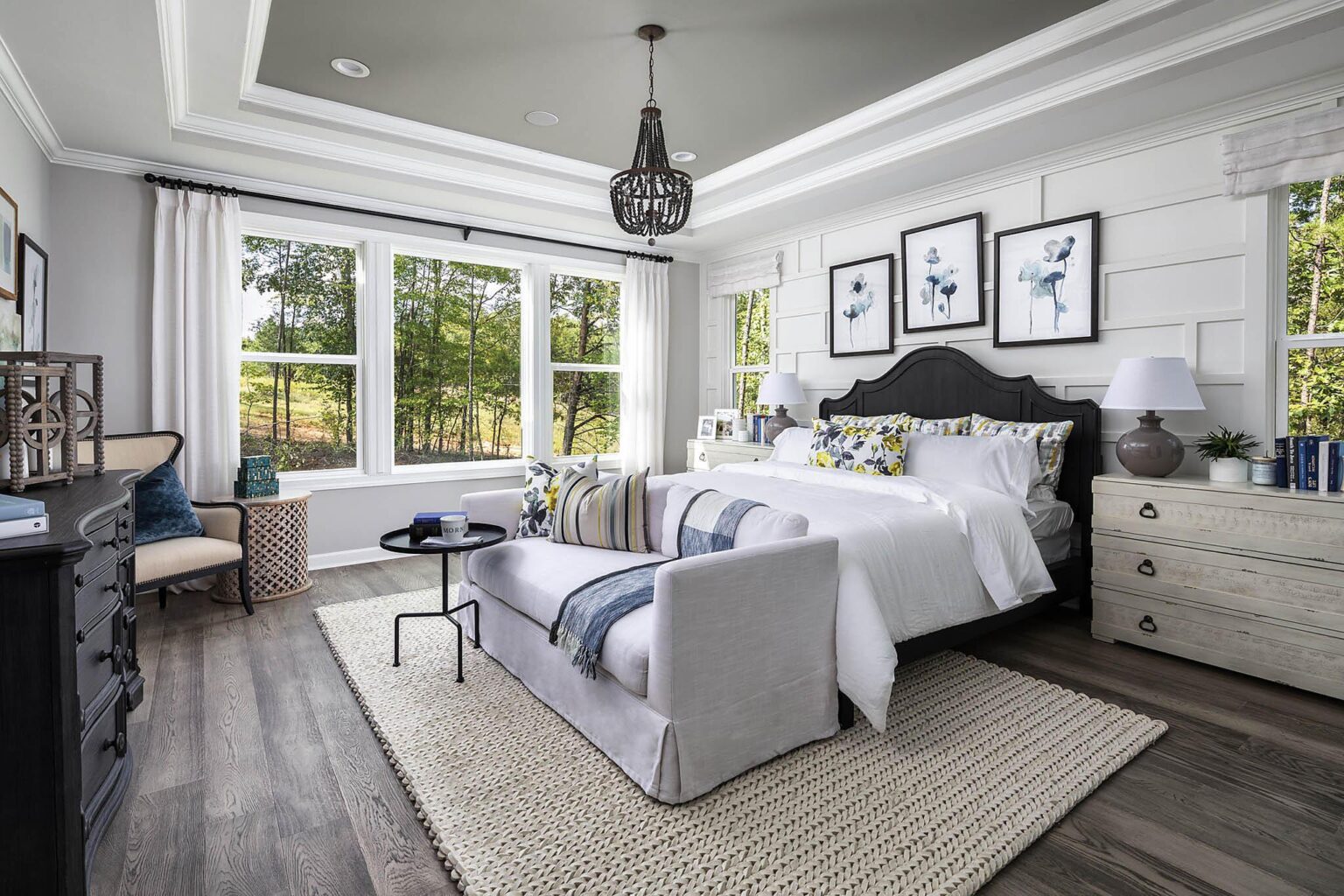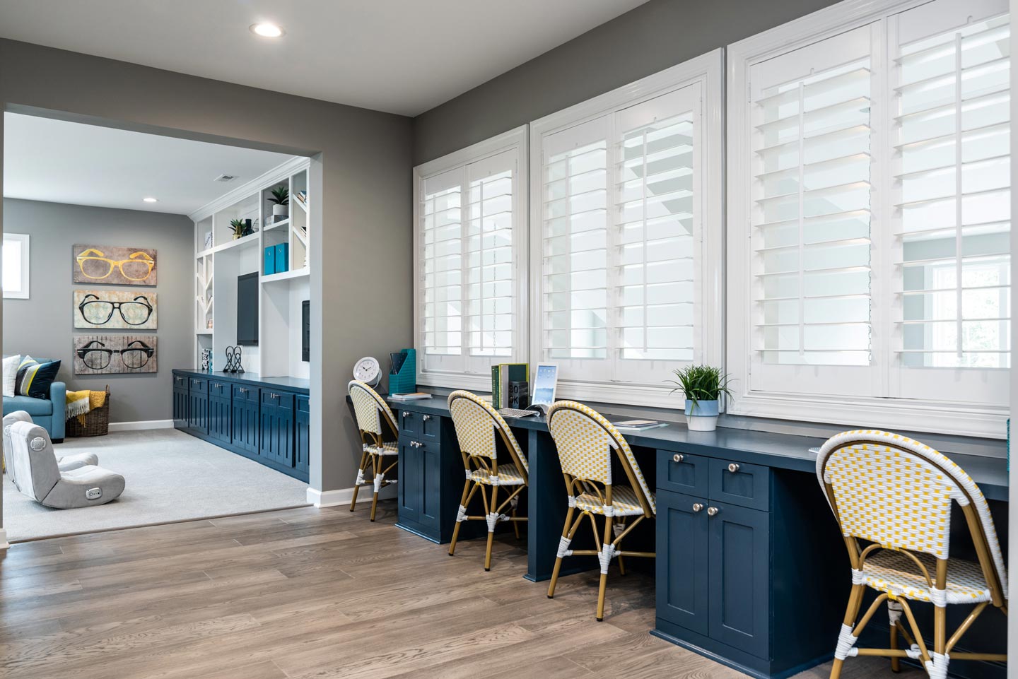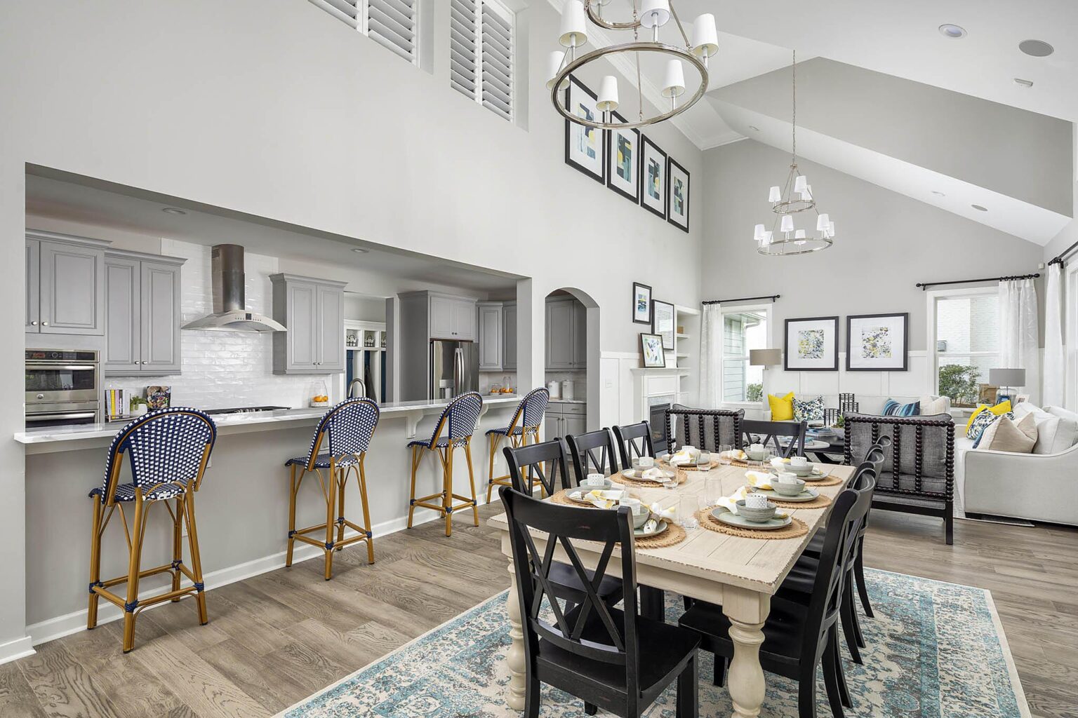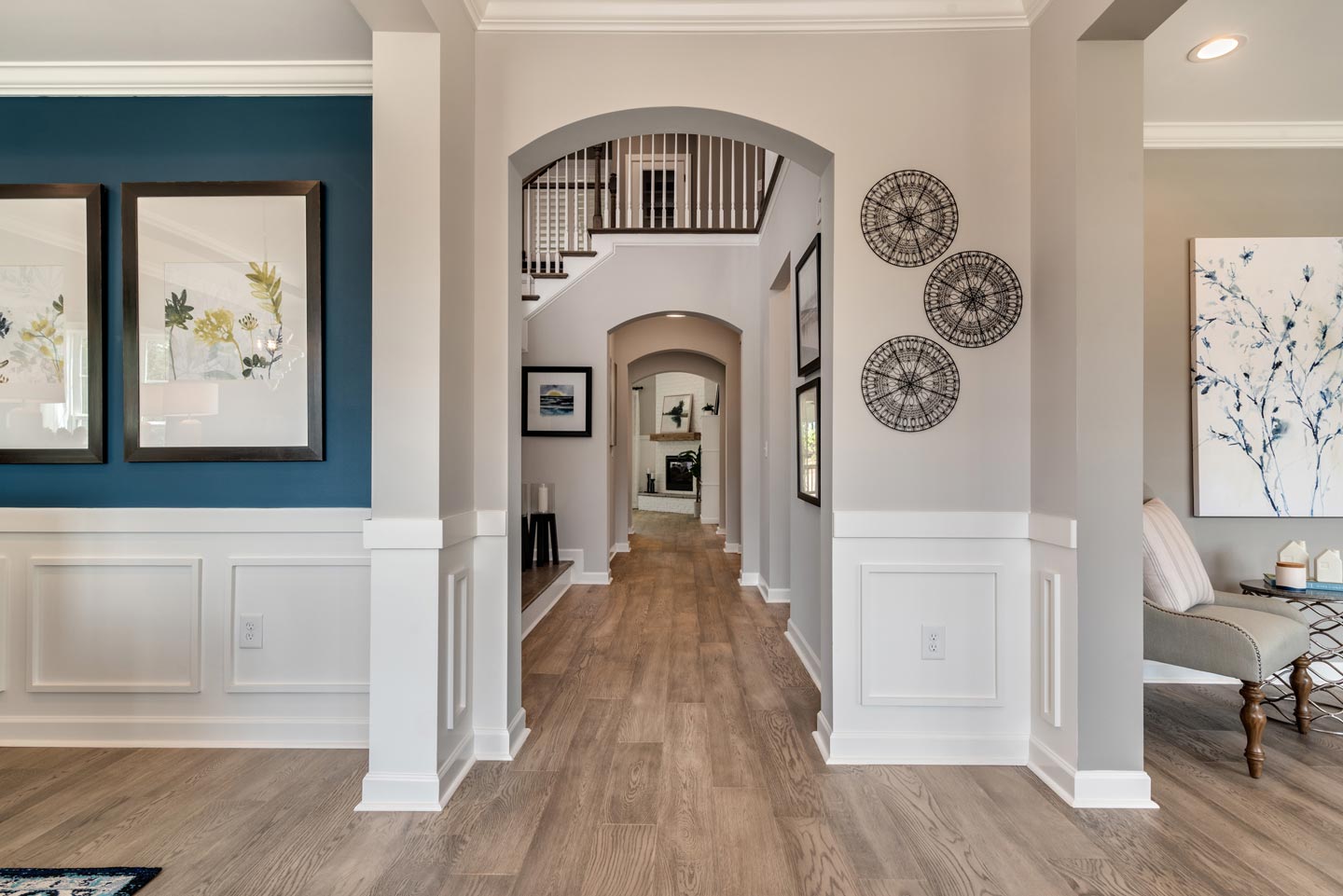 Elegant details and large gathering spaces make the Alpine a great home for family and friends. Archways lead from the foyer, past the Dining room, Study, and staircase, and on to the expansive Family/Morning room. This beautiful room features a vaulted ceiling, fireplace in the Family room, and the option to add one in the Morning room. The abundance of windows creates an open, airy feel, full of natural light. The open kitchen includes a built-in bar and overlooks this space, which is a fabulous area for gatherings, large and small. A convenient Butler’s Pantry connects the Dining room to the Kitchen. Take entertaining outdoors by adding a large covered porch off the Morning room. The first floor features a Premier Suite with two walk-in closets, two vanities, soaking tub and shower. Off the garage entry is a generous Hobby/Laundry room. Upstairs, 2 bedrooms share a Jack & Jill bath, and another secondary bedroom has an adjoining full bath. The Teen room overlooks the Morning room and can have a built-in workstation with desks. The Bonus room includes unfinished storage; you may extend the Bonus room or add a large Guest suite. Basement options are available. Tour our Alpine model home at River Reserve in Greer, SC.