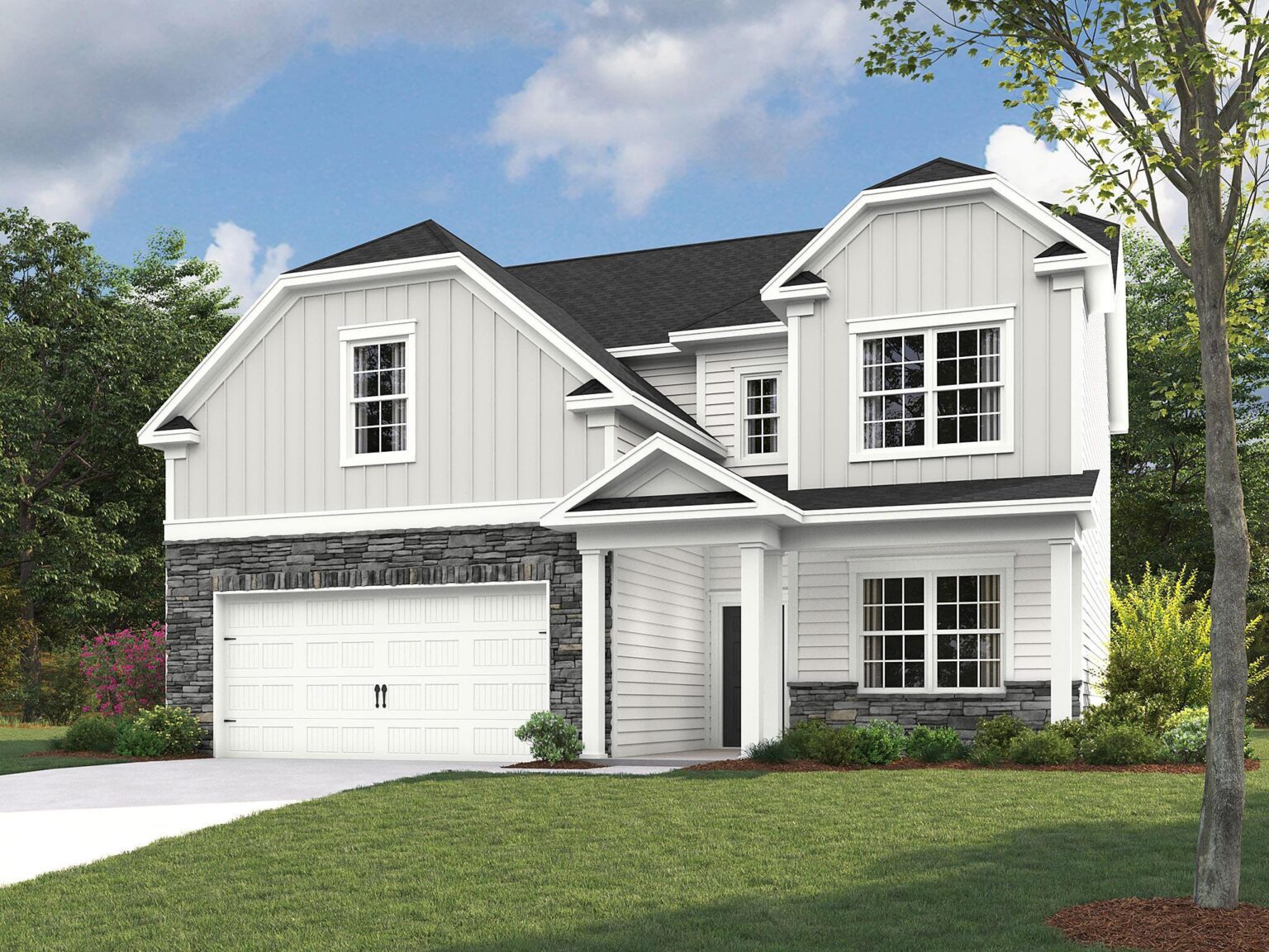 The Bradbury includes spaces for life today, including a first-floor Flex room (home office, formal dining, etc), Mudroom with space for a drop zone, and large walk-in kitchen pantry. The Bonus room above the garage offers extra space for gathering! When the weather changes, enjoy the optional gas fireplace in the Family room and the optional covered porch at the rear of the home. The Kitchen includes an island, and overlooks the Breakfast area and Family room. Upstairs is a spacious Premier Suite with optional tray ceiling, walk-in closet, and and 4-piece bath with large shower, double sink vanity and water closet. Both secondary bedrooms have walk-in closets. Laundry is conveniently located on the second floor. Stop by our Camber Woods neighborhood in Gastonia to tour our Bradbury model.