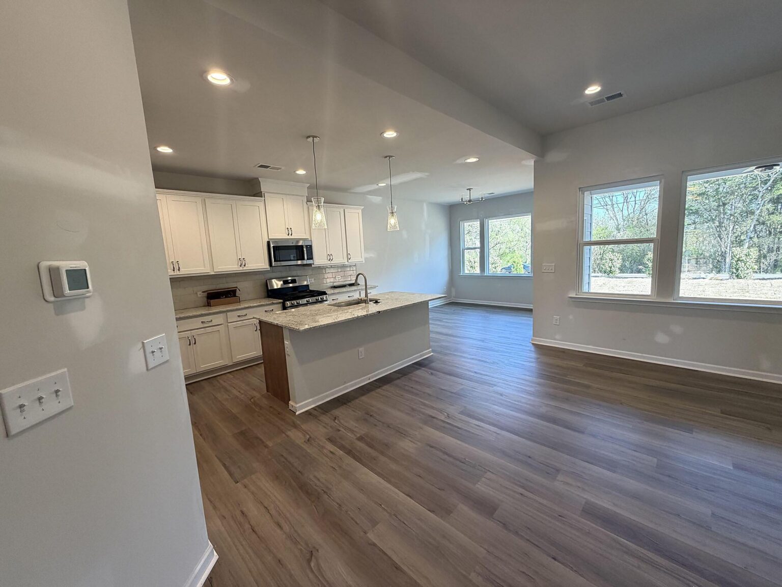 New 1-story home in Pendleton, SC, offering lower taxes, a convenient location, and a community pool which opens this Summer! There are 9' ceilings throughout, plus a rear covered porch. Enjoy the open-concept split-bedroom layout, with 2 bedrooms off the foyer, and the Primary Suite at the back of the home. The primary suite offers abundant windows, a large walk-in closet, and bathroom with large tiled shower, double-sink vanity with quartz counter, and tiled floor. The Kitchen features an island, painted cabinets, granite counters, soft-close doors, double trash pullout, and GE stainless steel appliances with a gas range and the microwave vented outside. The breakfast room leads to the rear covered porch. Off the garage is a large laundry room with a built-in drop zone. LVP flooring is throughout the main living space, with tile in the laundry and full baths, and carpet in the bedrooms. The Craftsman-style exterior includes Hardie® cement siding with shake and stone accents, plus 25-year shingles. Save on energy costs with the tankless gas hot water heater, radiant barrier sheathing, and an attic tent for the pull-down stairs. Community pool opens this Summer, and there will be natural walking trails. Live minutes from downtown Pendleton, Clemson, and Anderson, with easy access to I-85.