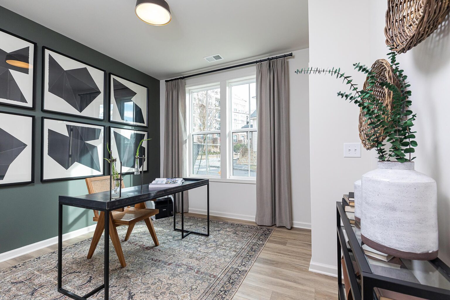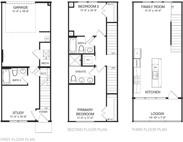The Welkin floor plan showcases our exclusive TOP-FLOOR LIVING™, designed with premium features to elevate your living experience. Enjoy the grandeur of vaulted ceilings and the brilliance of oversized casement windows that flood the space with natural light and offer stunning city views in select units. The gourmet kitchen, equipped with an oversized island and luxurious quartz countertops, seamlessly extends into the top-floor living areas, opening onto a covered loggia perfect for outdoor entertaining. Elegant hardwood stair treads and durable hard surface flooring grace the main living spaces, creating a cohesive and stylish environment. The middle floor is dedicated to comfort, featuring two spacious bedrooms and two well-appointed baths, while the first floor provides a flex room and a convenient garage.