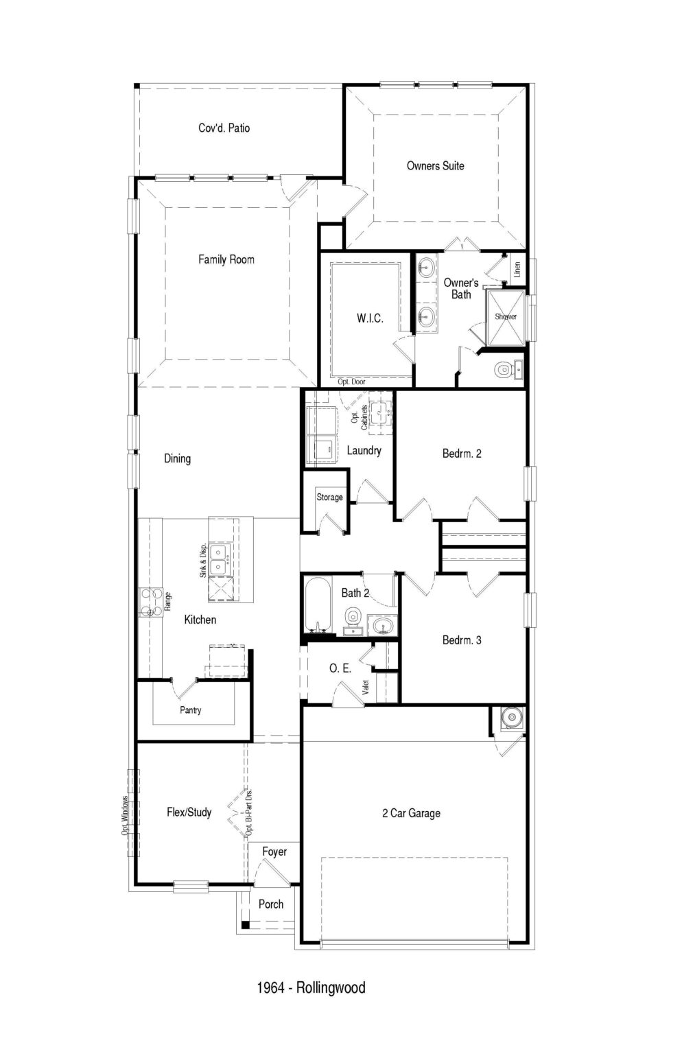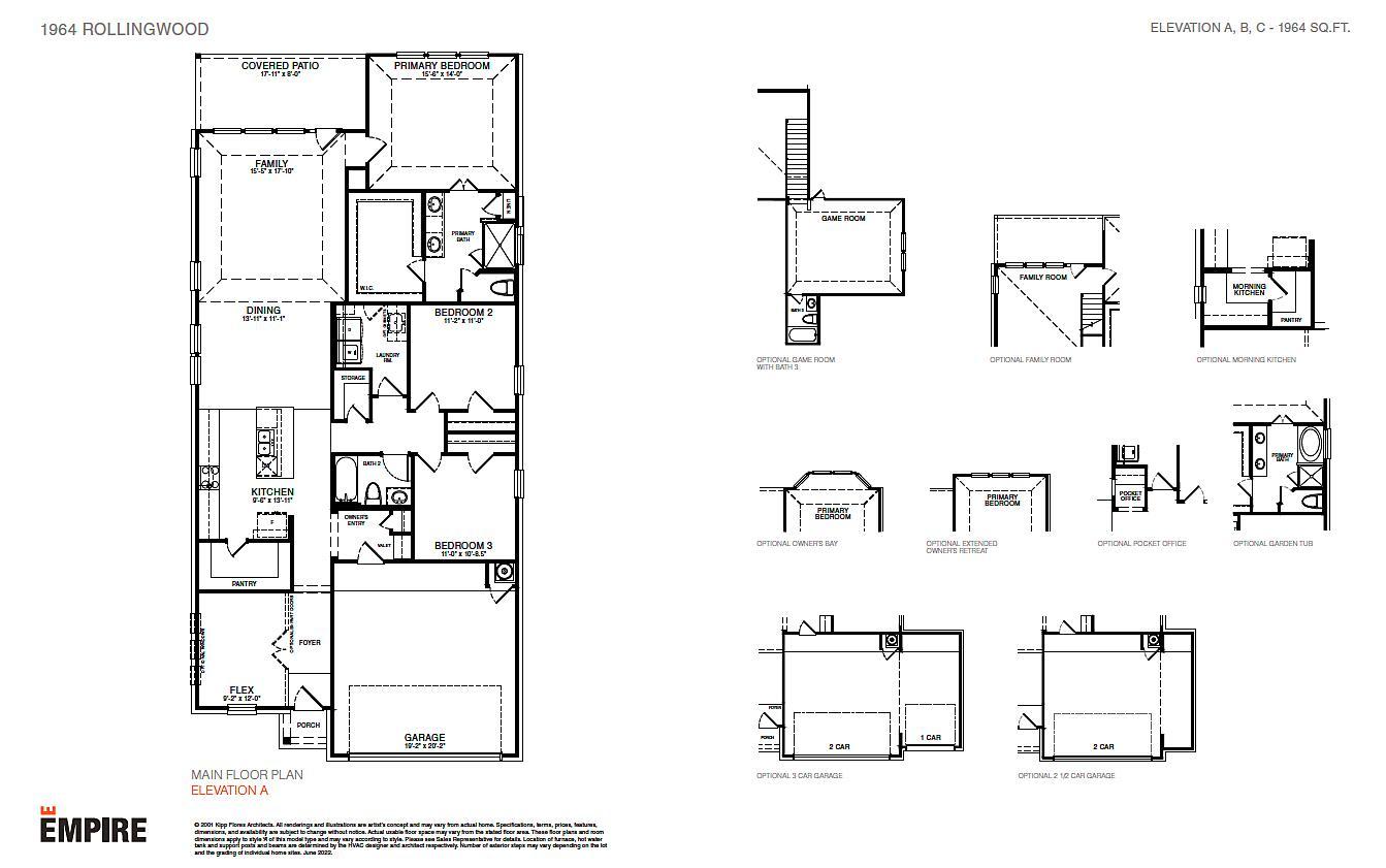 The Rollingwood floor plan was designed with the modern homebuyer in mind. It’s equipped with everything that families need, including a flex space that can be used for work, exercise or play, an open-concept dining area and family room, a storage area that can be converted into an optional pocket office and a covered patio. The kitchen has a walk-in pantry that keeps items stowed away and has an optional morning kitchen, while the primary bedroom boasts an enviable walk-in closet and ensuite. An optional game room with a 3rd bathroom or extra family area can also be added to the plan.