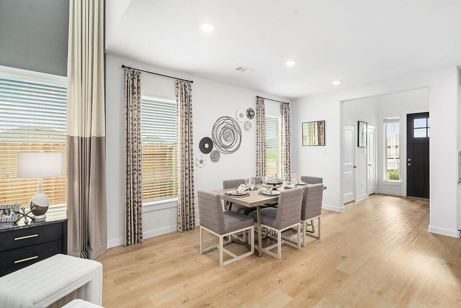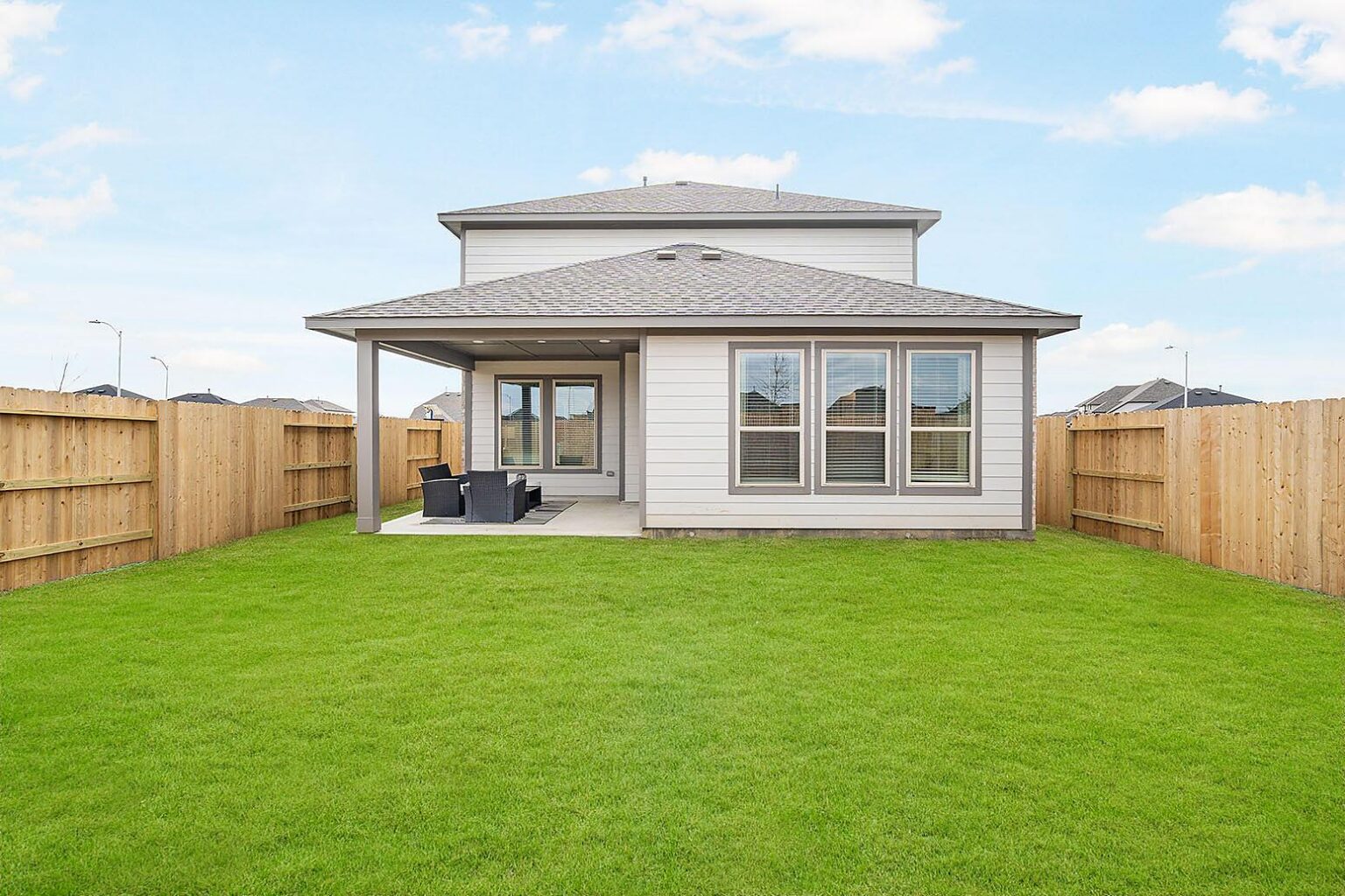 This beautiful 2-story plan features 4 bedrooms, 2.5 bathrooms, and an open-concept dining and family room. The kitchen is adorned with 42-inch cabinets and an abundance of counter space. Additional entertainment is made with ease in the oversized game room upstairs or out on the covered patio. The primary retreat offers a spa-like ensuite and a spacious walk-in closet, connected to the laundry room for your convenience.