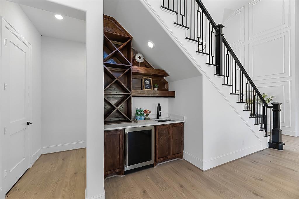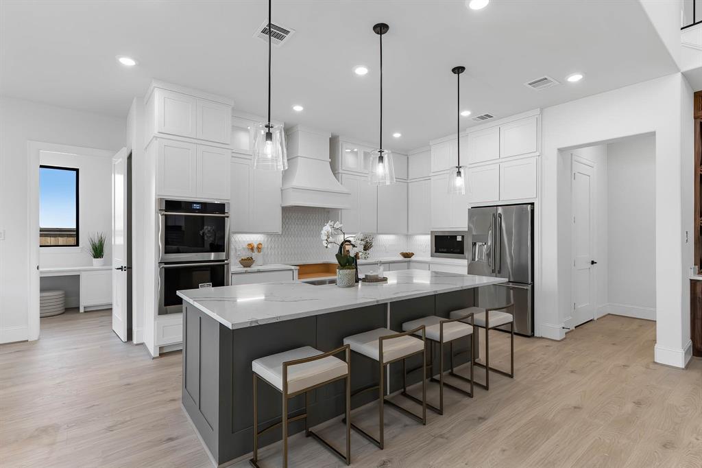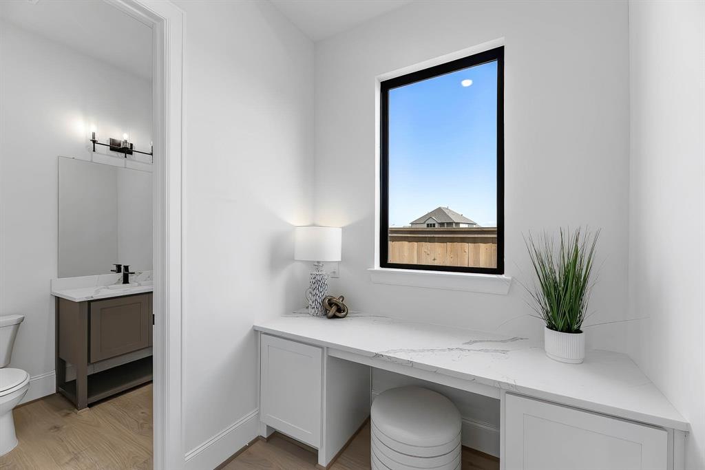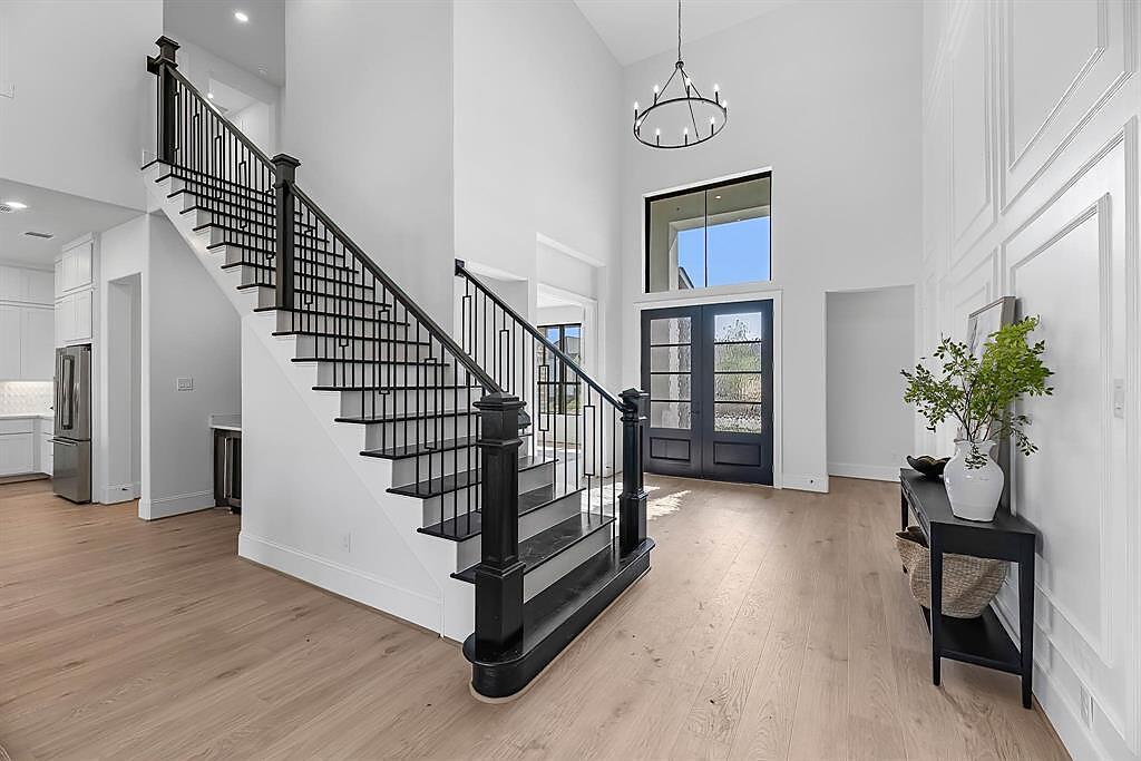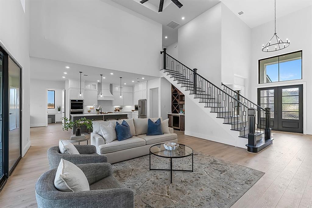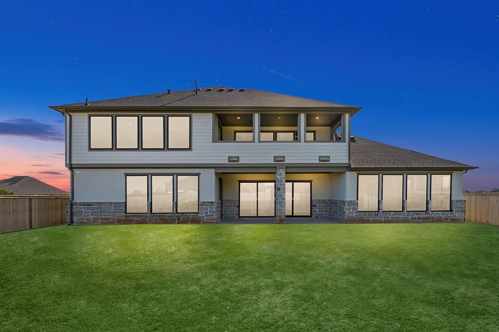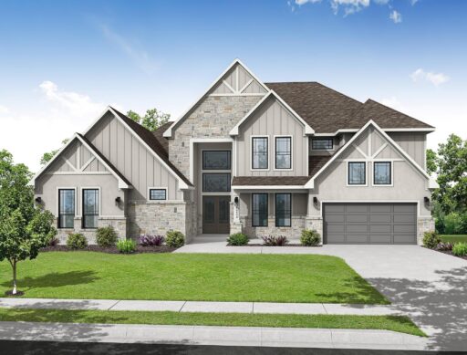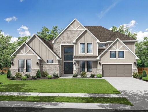 The Bridgeport floorplan delivers an impressive 4,475 sq. ft. of elevated design and everyday function across two beautifully crafted stories. The first level centers around an expansive open-concept living space, anchored by a gourmet kitchen with quartz countertops, Benedettini® cabinetry, and a 36" 6-burner cooktop. A casual dining area opens to the Texas-sized covered patio—ideal for indoor-outdoor entertaining—while a dramatic two-story study and wine grotto add charm and sophistication. The private first-floor primary suite features a spa-inspired bath with a freestanding tub, dual Delta® showerheads, and a walk-in closet that dreams are made of. Upstairs, the layout shines with three spacious bedrooms, two full baths, a game room with balcony access, and an open gallery overlooking the main living space below. With five total bedrooms, five bathrooms, and thoughtful additions like a morning bar, porte-cochère, and energy-saving tankless water heater, the Bridgeport perfectly blends bold architecture with livable luxury. Whether hosting guests or enjoying quiet moments, this home is designed to meet every need—stylishly.