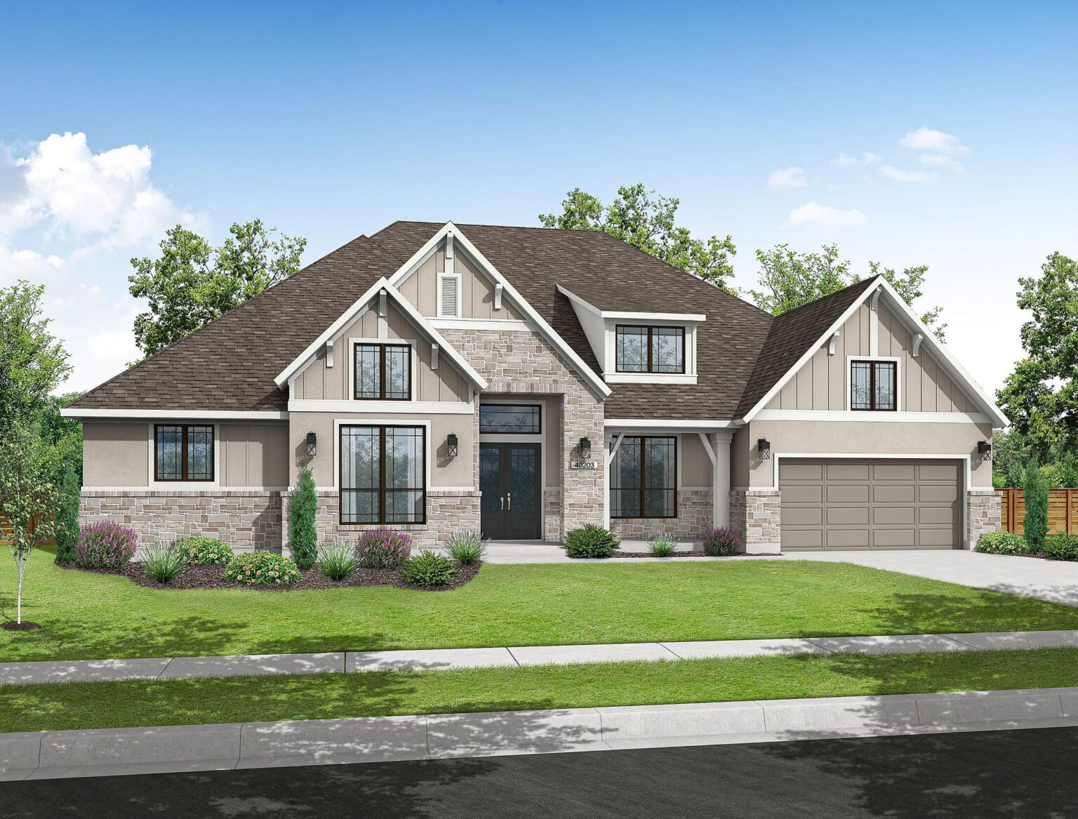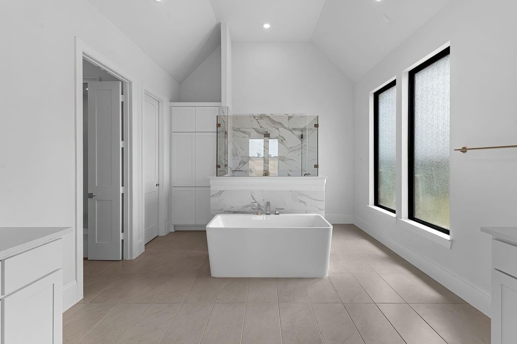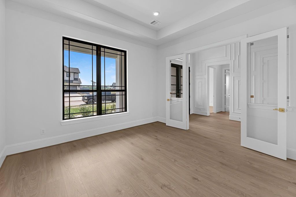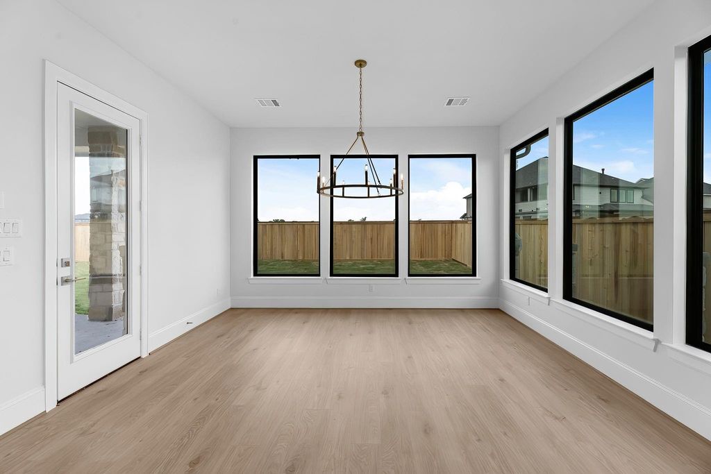 The Sanderson floorplan offers a thoughtful and spacious single-story design with 3,888 sq. ft. of functional elegance. At the heart of the home is a wide open-concept living area that flows seamlessly into the kitchen and casual dining space, ideal for both everyday living and entertaining. The kitchen is equipped with a 36" 6-burner cooktop, double ovens with air fryer and sous vide, as well as a quartz-topped island perfect for gatherings. The primary suite is privately tucked in the back corner with direct patio access, a spa-like bath featuring a freestanding tub and frameless glass shower, and a custom walk-in closet. Three secondary bedrooms are strategically placed—two near the front with a shared bath and one in its own wing with a full bath nearby—ideal for guests or multi-generational living. A formal dining room, private study, and a versatile game or media room provide both quiet retreats and entertainment spaces. Outdoors, a Texas-sized covered patio with sliding glass doors invites easy indoor-outdoor living, and the home’s tankless water heater and LED lighting add everyday efficiency. Every room is placed with purpose, creating a smooth, intuitive flow that supports a variety of lifestyles.