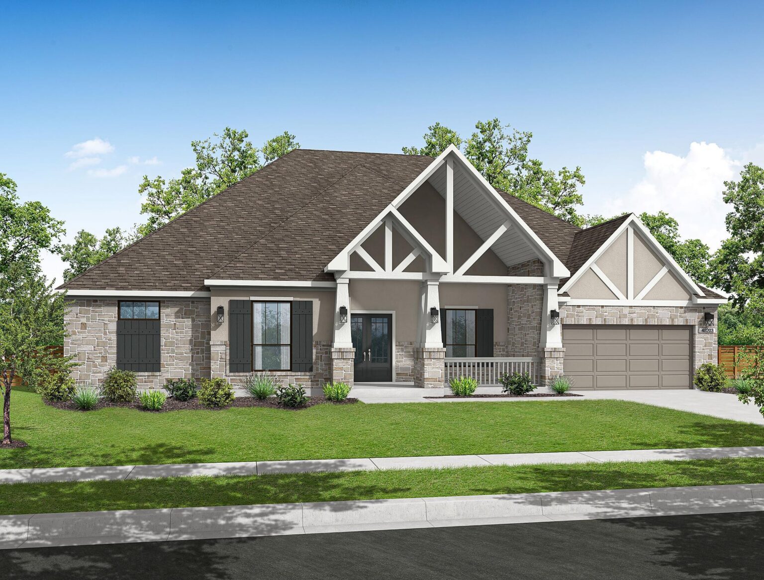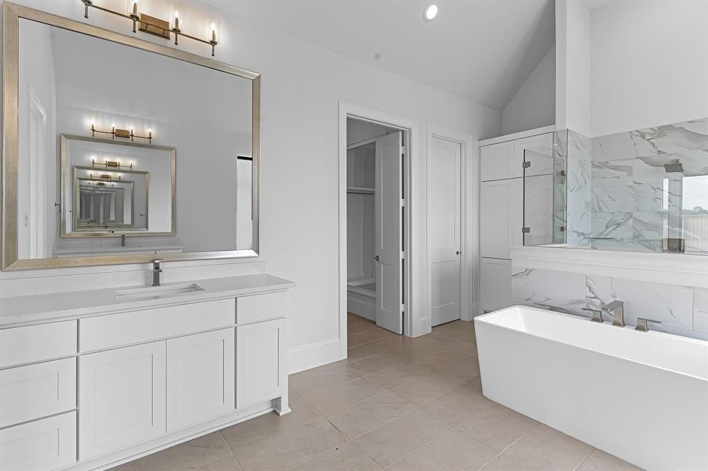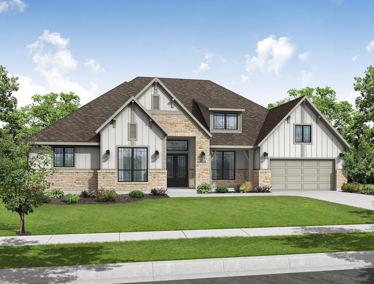 The Sanderson floorplan offers a thoughtful and spacious single-story design with 3,888 sq. ft. of functional elegance. At the heart of the home is a wide open-concept living area that flows seamlessly into the kitchen and casual dining space, ideal for both everyday living and entertaining. The kitchen is equipped with a 36" 6-burner cooktop, double ovens with air fryer and sous vide, as well as a quartz-topped island perfect for gatherings. The primary suite is privately tucked in the back corner with direct patio access, a spa-like bath featuring a freestanding tub and frameless glass shower, and a custom walk-in closet. Three secondary bedrooms are strategically placed—two near the front with a shared bath and one in its own wing with a full bath nearby—ideal for guests or multi-generational living. A formal dining room, private study, and a versatile game or media room provide both quiet retreats and entertainment spaces. Outdoors, a Texas-sized covered patio with sliding glass doors invites easy indoor-outdoor living, and the home’s tankless water heater and LED lighting add everyday efficiency. Every room is placed with purpose, creating a smooth, intuitive flow that supports a variety of lifestyles.