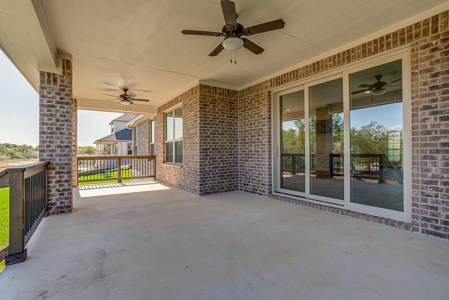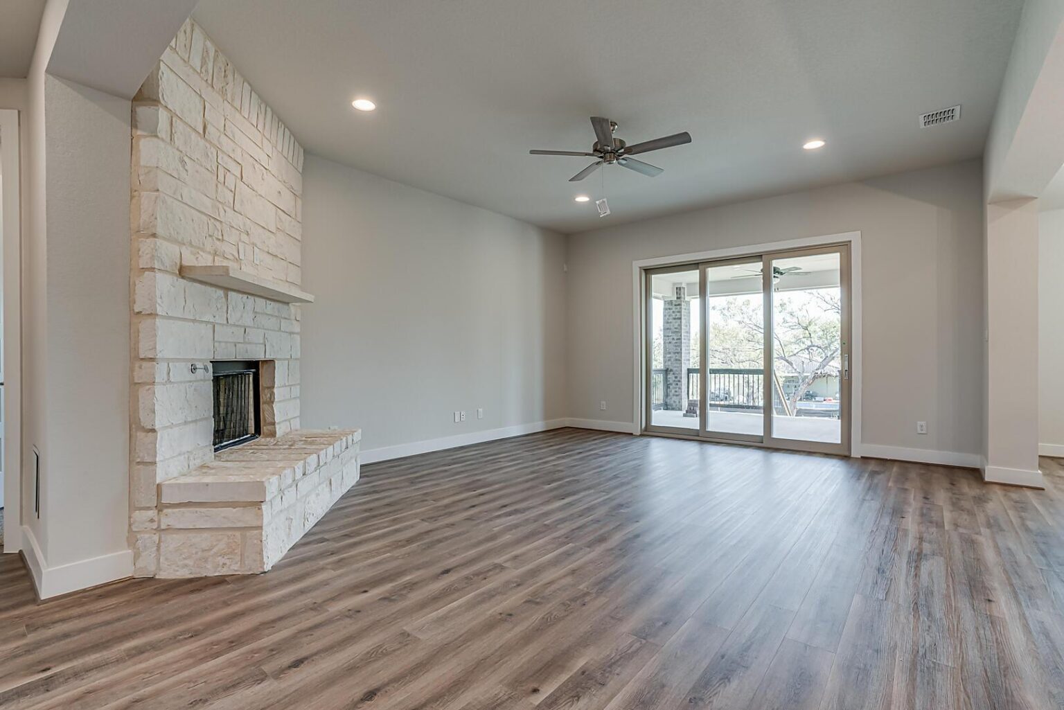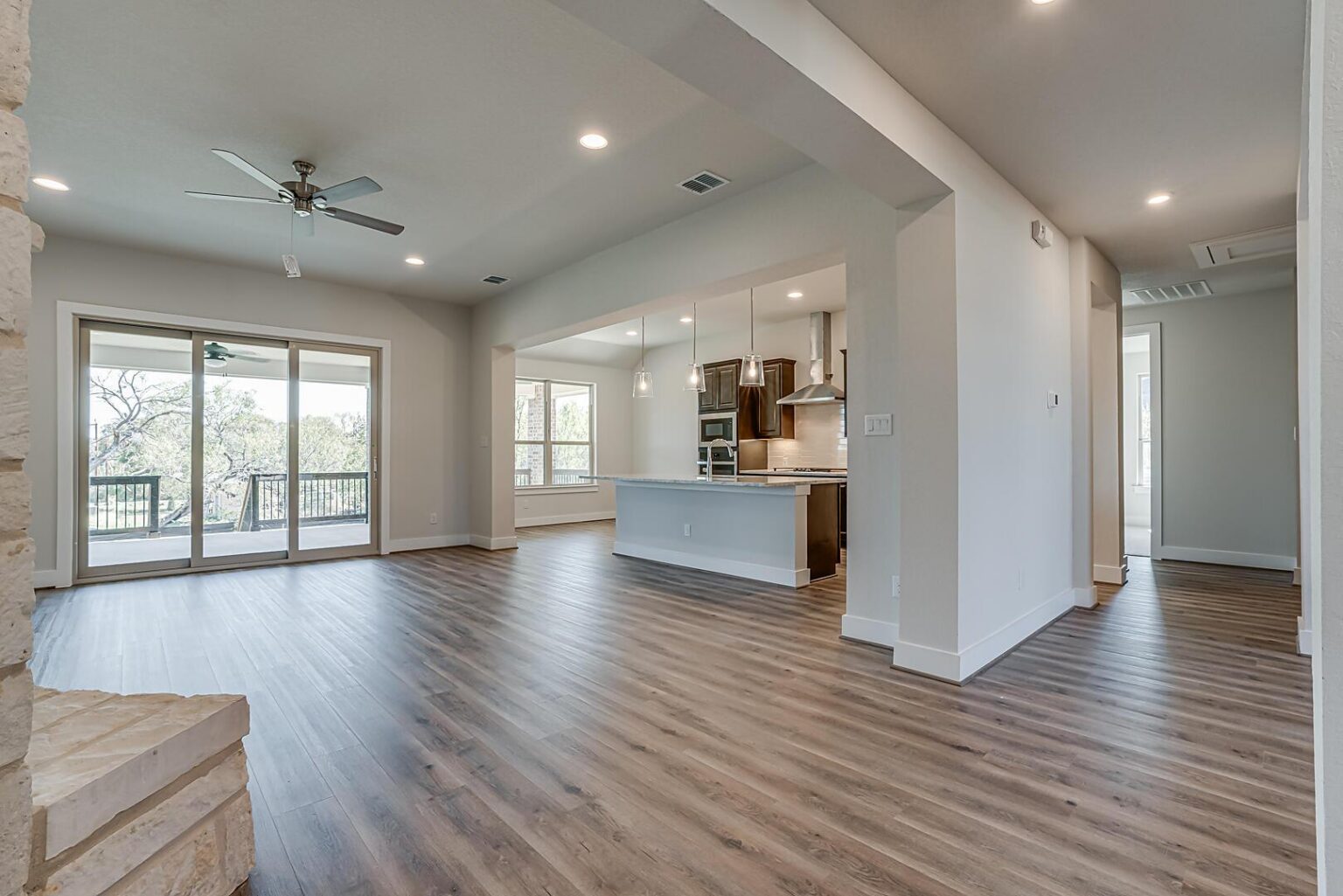 The Calaveras Plan at Everly Estates showcases a refined 2,714 sq. ft. open-concept design perfectly situated on an expansive 1/2 acre homesite. Engineered for peak efficiency, the residence includes a high-performance cooling system, Low E 3 solar reflective windows, and a gas tankless water heater to minimize utility costs. The interior is defined by elegant luxury vinyl plank flooring and a wood-burning fireplace featuring a custom stone surround and mantle. A designer kitchen serves as the heart of the home, boasting J-Kraft custom shaker 42” cabinetry, premium GE® stainless steel appliances, and a specialized Kinetico drinking water system. The exterior is equally impressive, featuring a brick and stone elevation and a professional irrigation system that maintains the native drought-resistant landscaping.