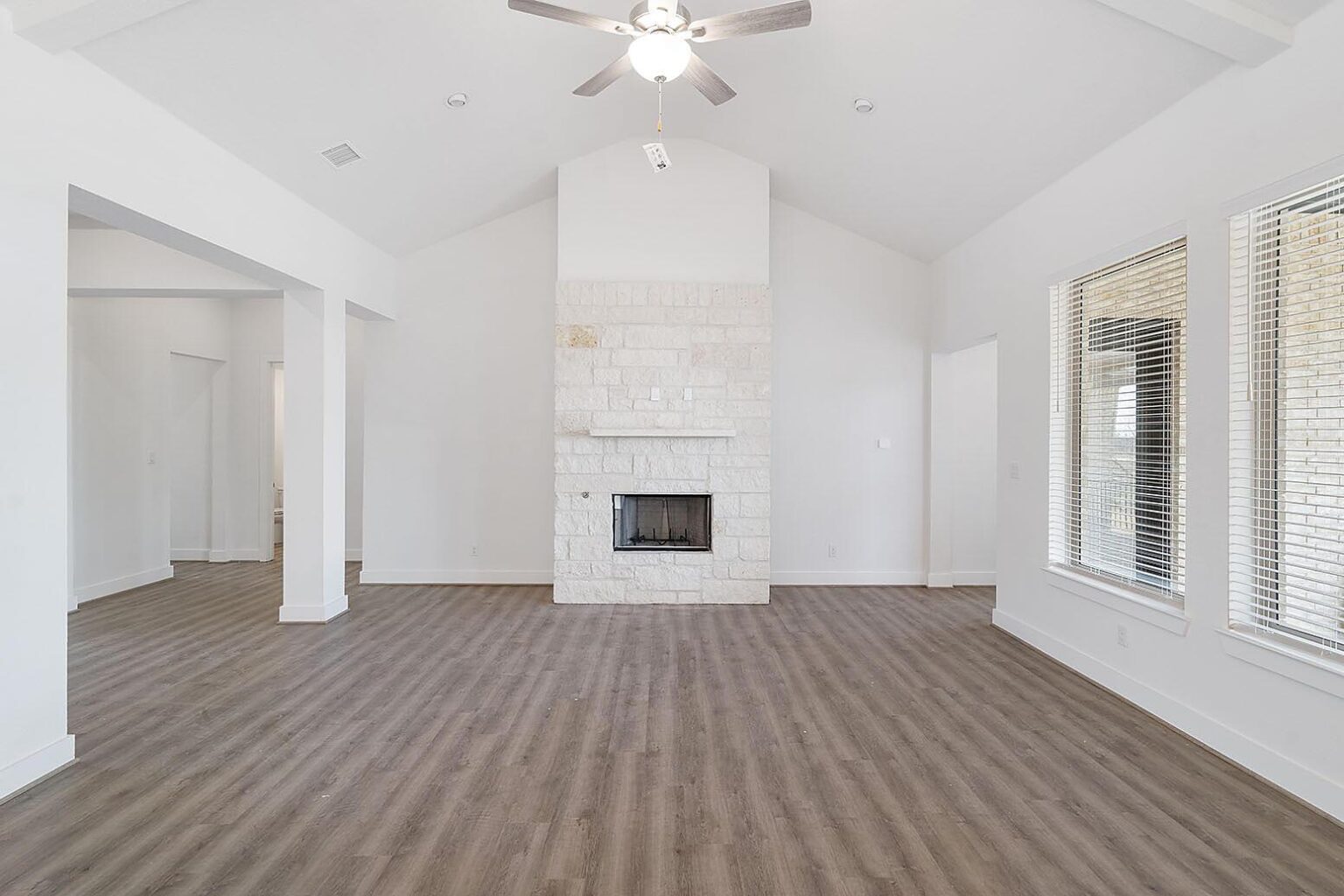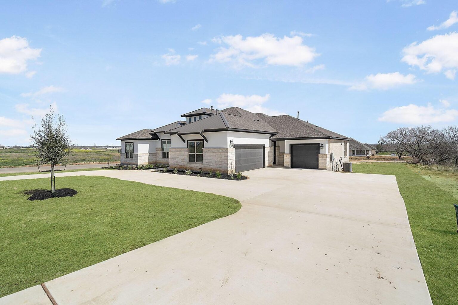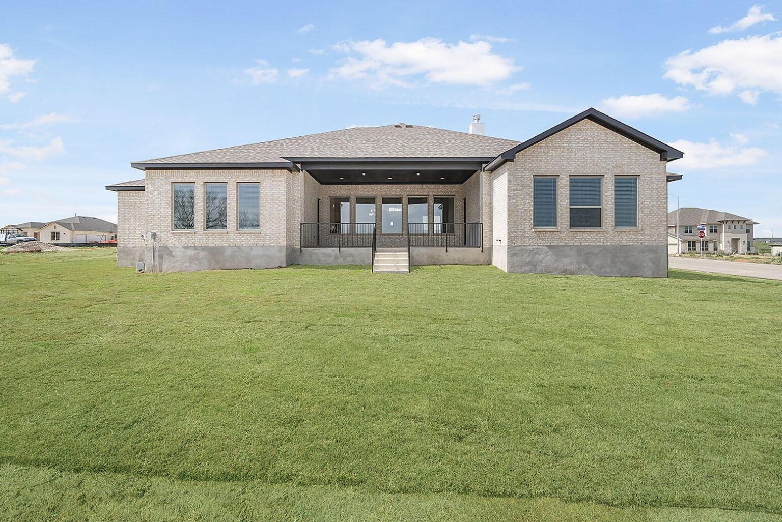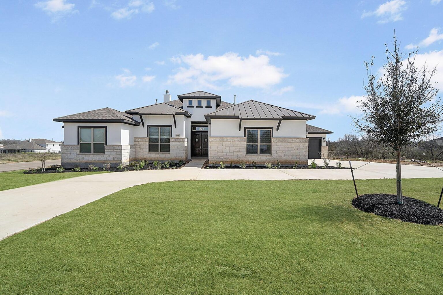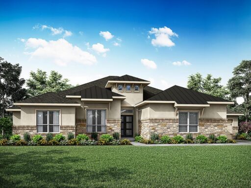 The Pedernales Plan at Everly Estates is a grand single-story architectural design offering 3,391 sq. ft. of living space on a sprawling 1/2 acre homesite. The heart of this home is an expansive, open-concept family, dining, and kitchen area featuring dramatic 20’ ceiling heights, creating an atmosphere of unmatched scale and light. For those who love the outdoors, the residence includes a massive standard covered patio, providing a premier space for entertaining guests or enjoying the native, drought-resistant landscaping. The primary suite serves as a true private retreat, now featuring two oversized walk-in closets and a spa-like bath with a Royal Bath garden tub. Modern efficiency is built into every detail, from the HVAC system and Low E 3 windows to the eco-friendly gas tankless water heater. The gourmet kitchen remains a culinary focal point, boasting J-Kraft custom shaker 42” cabinetry and a premium GE® stainless steel appliance suite. Meticulously finished with a brick and stone elevation, this home blends Hill Country charm with modern living.