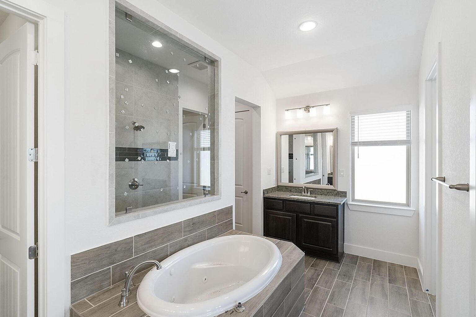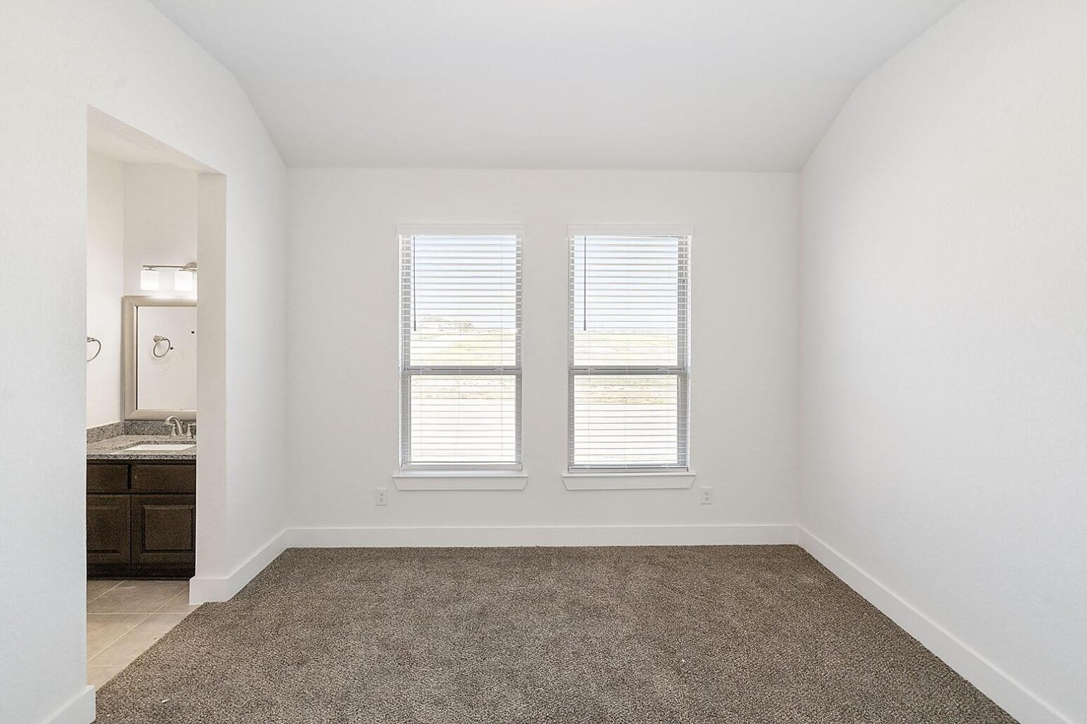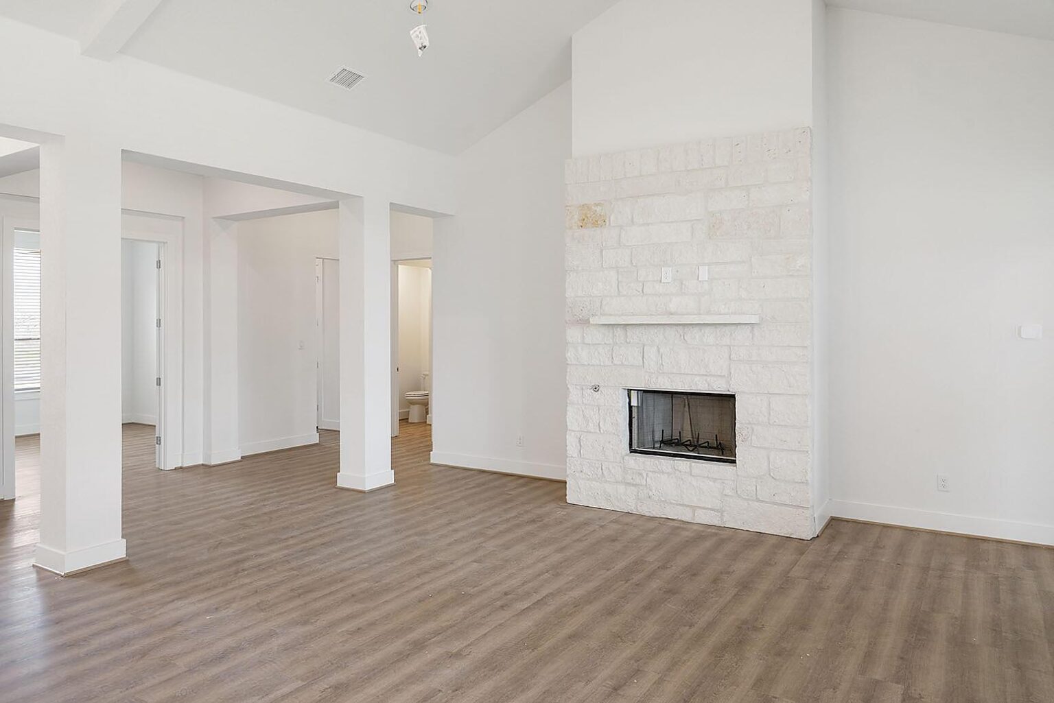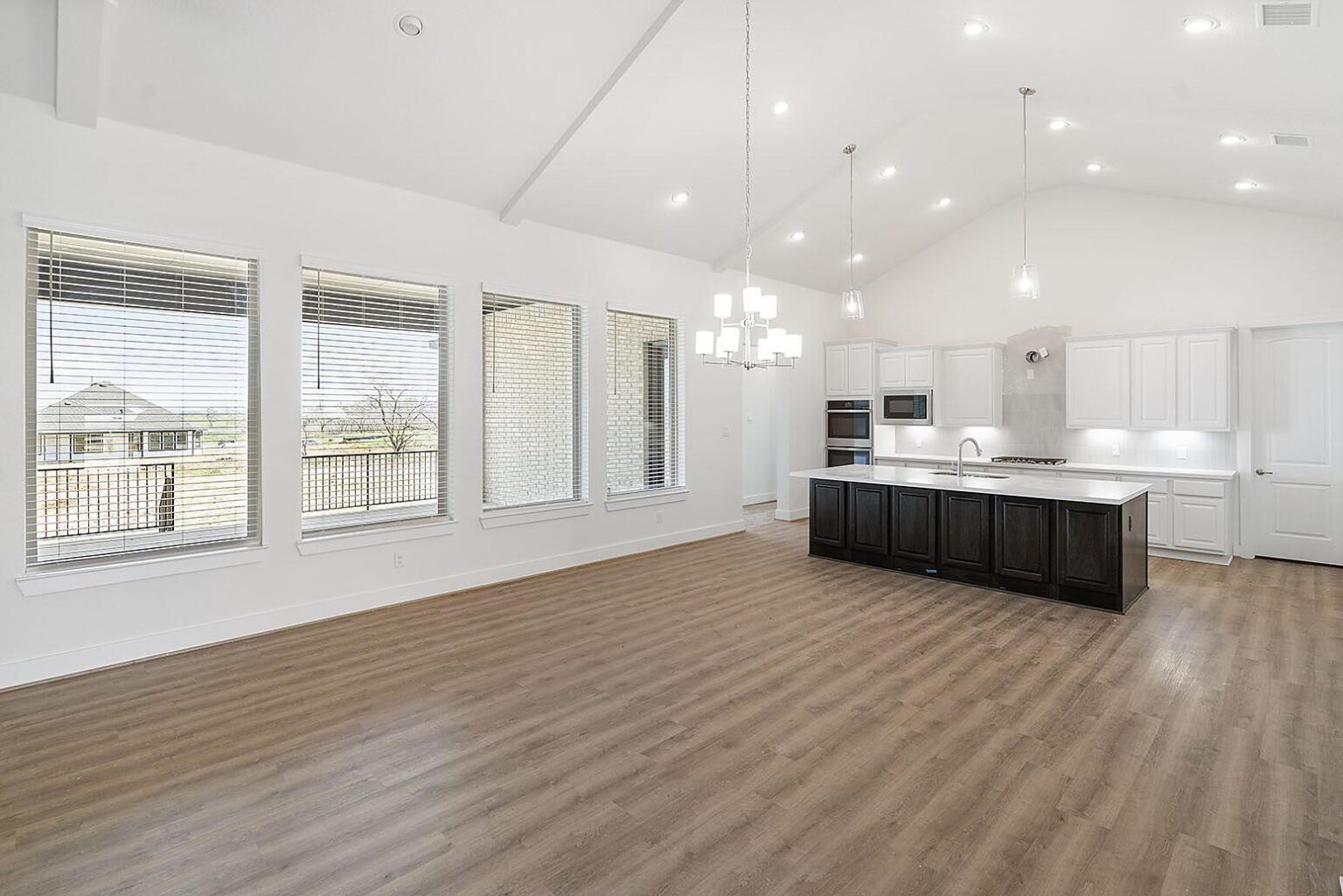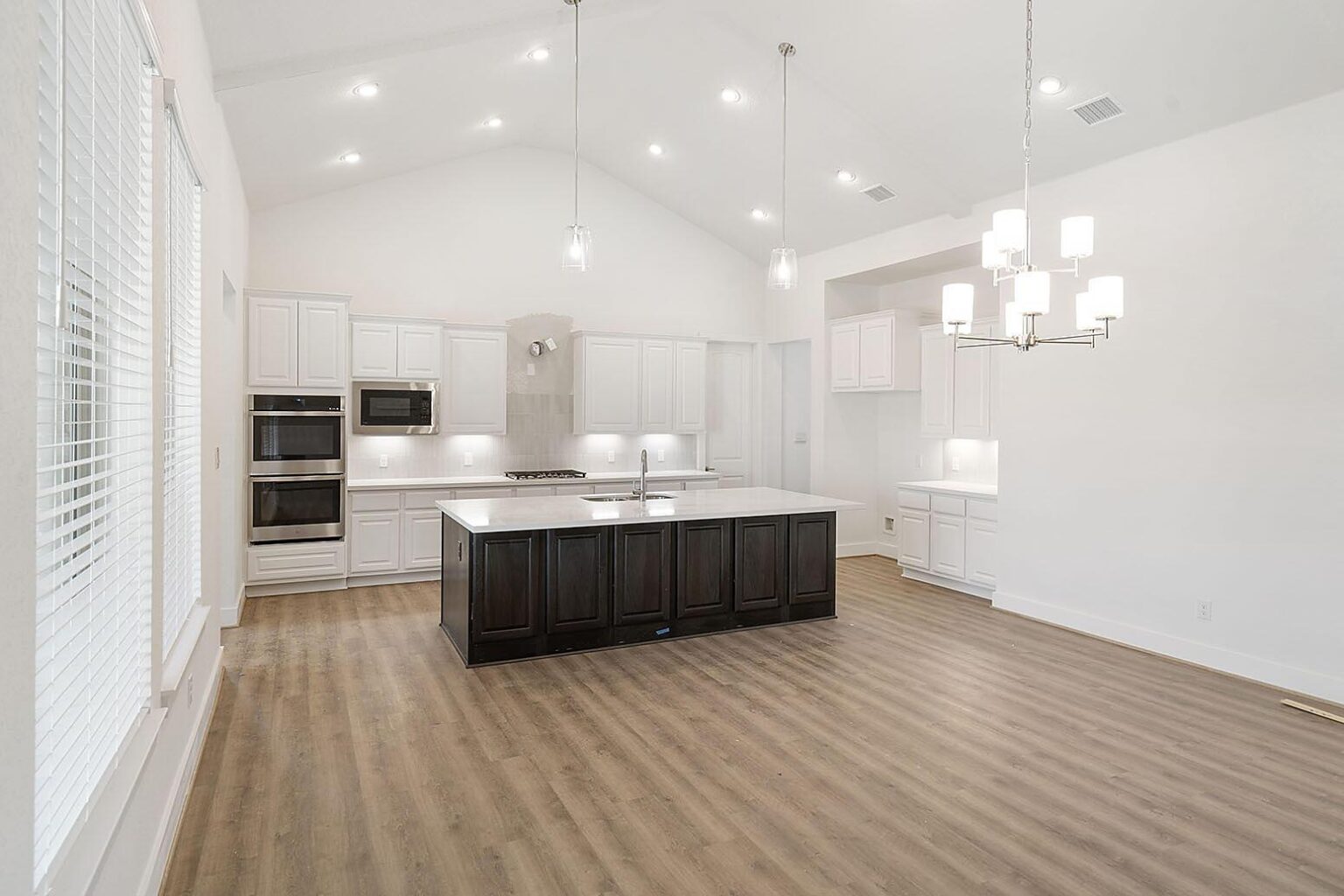 The Pedernales Plan at Everly Estates is a grand single-story architectural design offering 3,391 sq. ft. of living space on a sprawling 1/2 acre homesite. The heart of this home is an expansive, open-concept family, dining, and kitchen area featuring dramatic 20’ ceiling heights, creating an atmosphere of unmatched scale and light. For those who love the outdoors, the residence includes a massive standard covered patio, providing a premier space for entertaining guests or enjoying the native, drought-resistant landscaping. The primary suite serves as a true private retreat, now featuring two oversized walk-in closets and a spa-like bath with a Royal Bath garden tub. Modern efficiency is built into every detail, from the HVAC system and Low E 3 windows to the eco-friendly gas tankless water heater. The gourmet kitchen remains a culinary focal point, boasting J-Kraft custom shaker 42” cabinetry and a premium GE® stainless steel appliance suite. Meticulously finished with a brick and stone elevation, this home blends Hill Country charm with modern living.